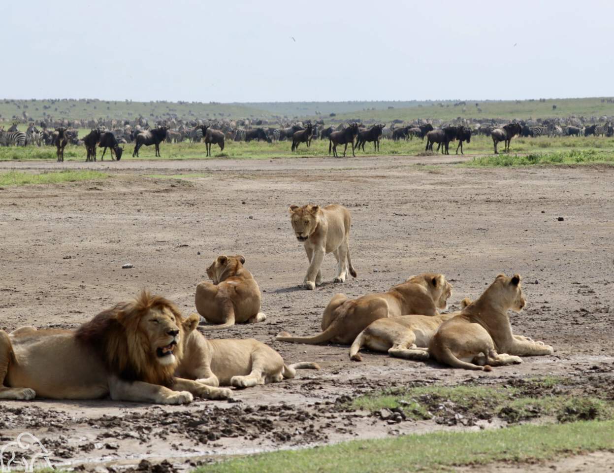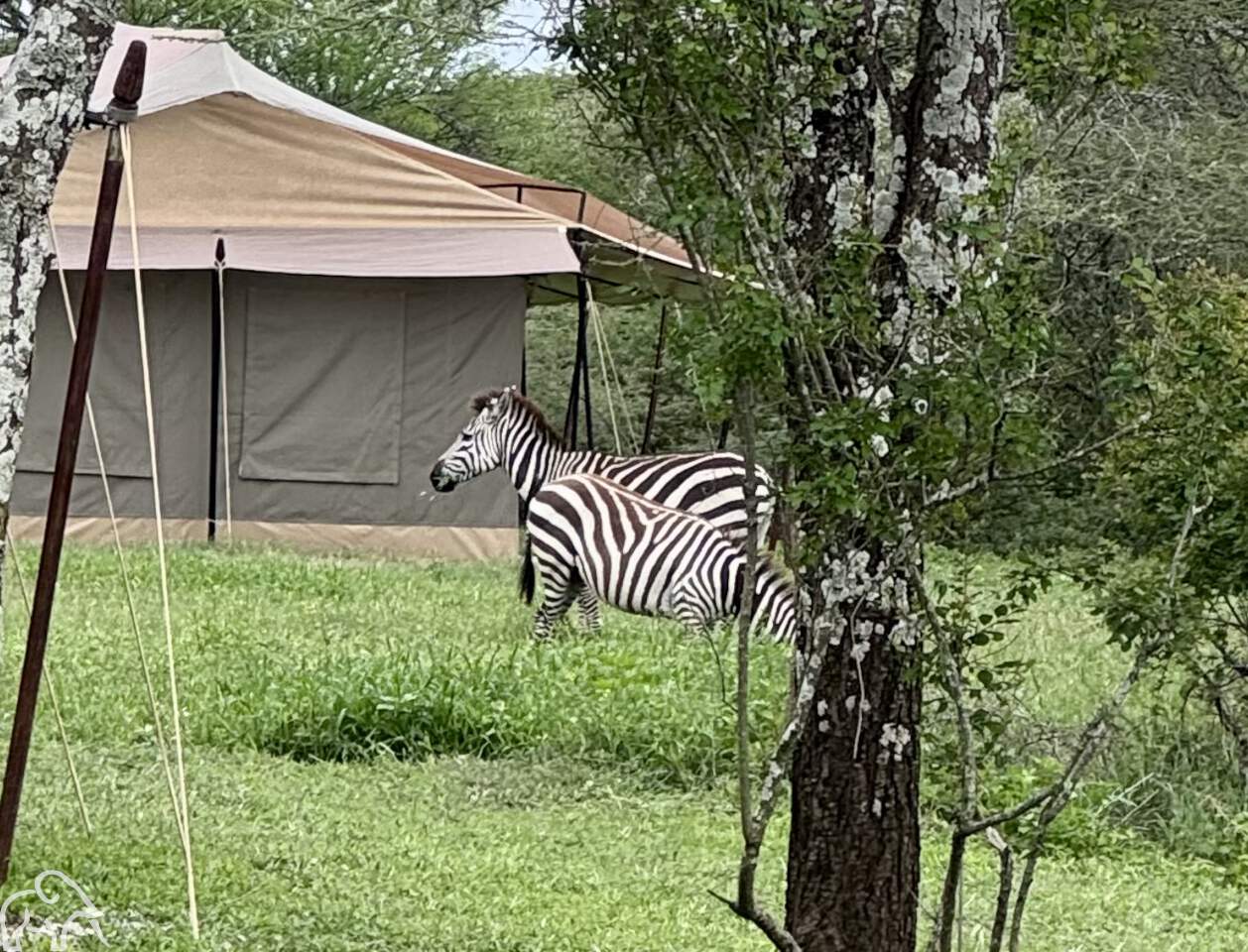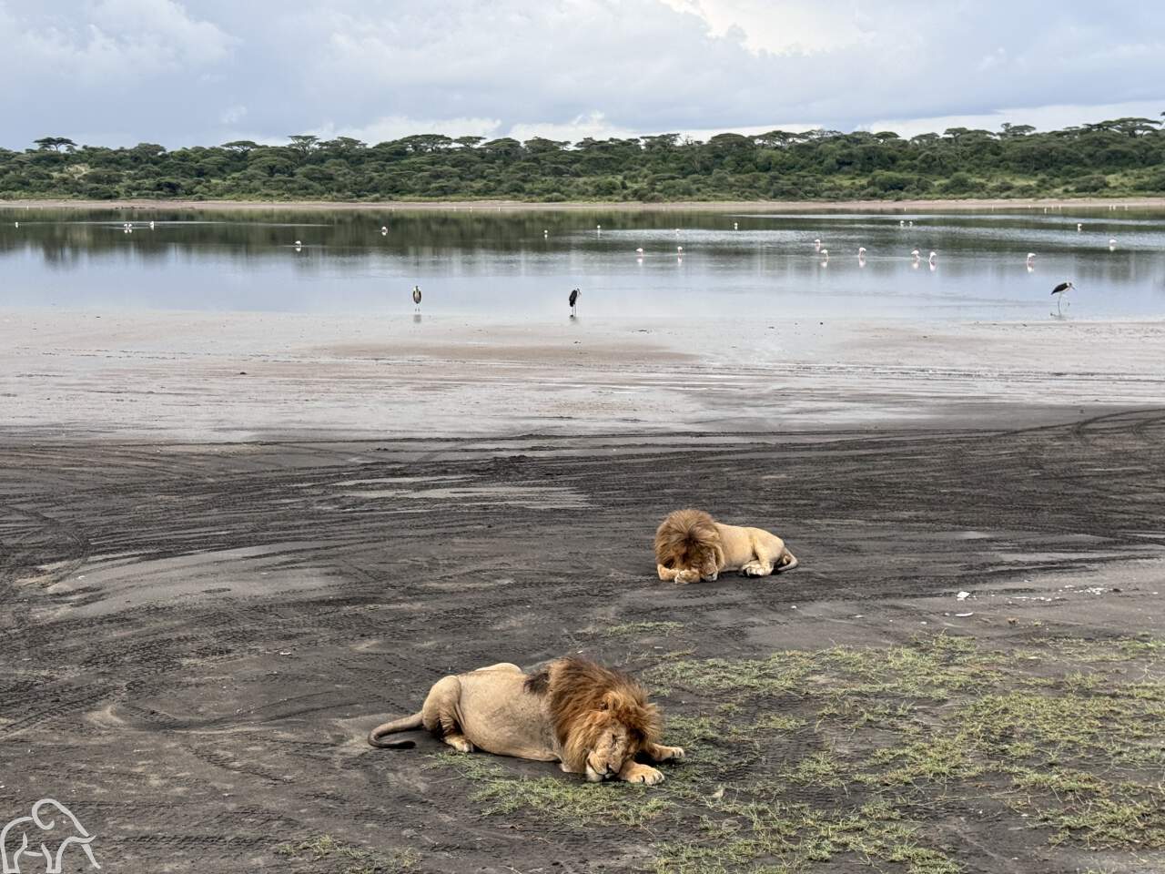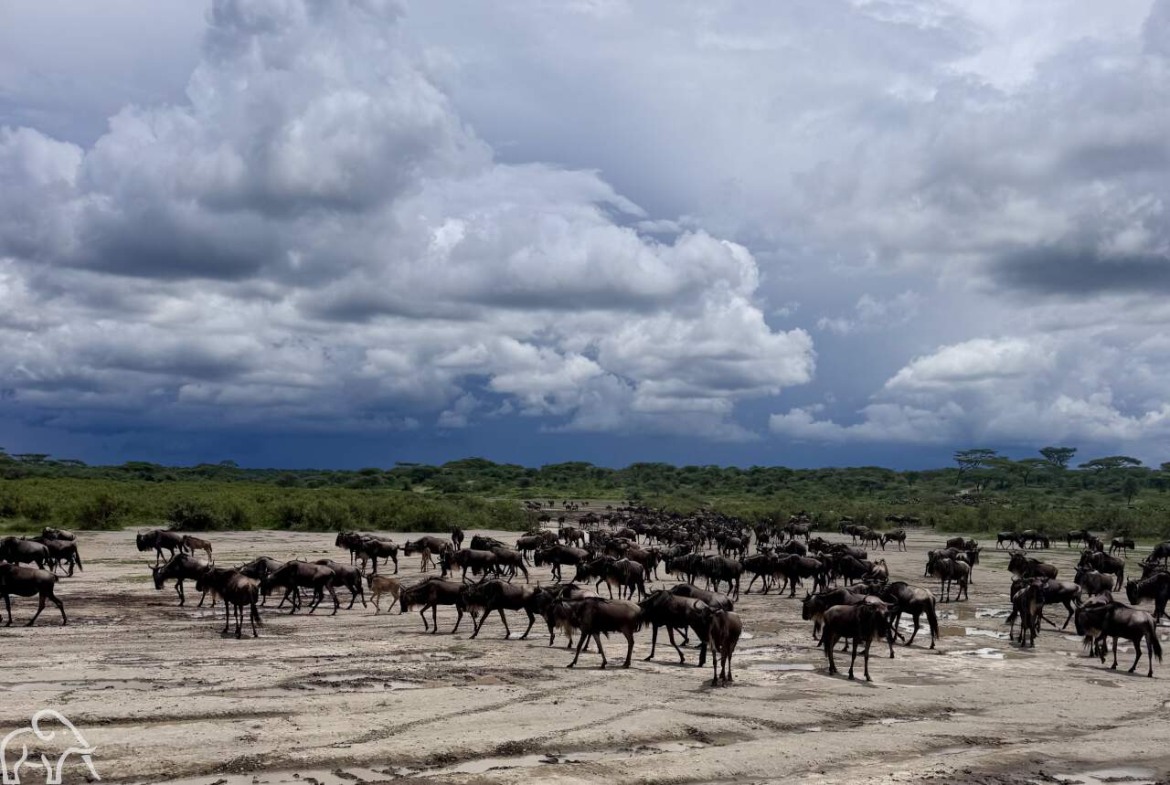 Eenmaal geland troffen we Dominic aan, onze gids / chauffeur met wie we het jaar daarvoor al drie weken waren opgetrokken, dus dat was een heel fijn weerzien. Hij vertelde dat het grote regenseizoen dit jaar al drie weken eerder was begonnen. Dat gingen we de komende weken nog vaak horen! Maar nu was het droog en al op onze trip naar de lodge kwamen we enorm grote kuddes gnoe’s (met kalfjes) en zebra’s tegen. Onze tented lodge was een andere die we geboekt hadden maar bleek een upgrade te zijn. Aanpassen aan veranderende omstandigheden zou voor de rest van onze trip het hoofdmotto worden. Het was een prachtig gelegen kamp met royaal uitzicht over Lake Ndutu. De zebra’s graasden voor onze tent en om ons heen zagen we giraffes, antilopen en ander wild dat ons kamp wilde bekijken. Het viel ons op dat het veel groener was dan vorig jaar in het droge seizoen (logisch), wat toch ook wel weer erg mooi is. Ook viel het ons op dat de aantallen en verscheidenheid van allerlei vogels veel groter was dan vorig jaar. Wat dat betreft vielen we met onze neus in de boter.